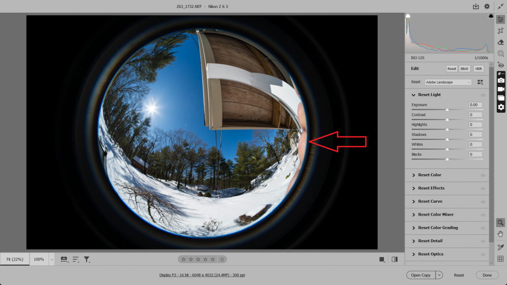Here are my knuckles (red arrow) on display in the shot as I held the camera. The colors are rich and vibrant and a nice starburst is rendered on the Sun. No edits were done yet. Shot with a Nikon Z6iii. ISO 125 | f/16 | 1/1000 sec