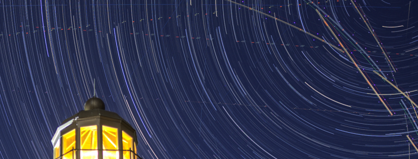 Here’s a star trail image of Scituate Lighthouse located south of Boston, MA. Due to its proximity to Boston’s Logan Airport, plane trails are unavoidable. Notice the curve of the trails created since the planes turn as they gain altitude. Yes, it’s a special kind of mess. Plane trails are commonly linear, but when the subject is in close proximity to a busy international airport, like Scituate Lighthouse is, now the trails are curved, adding to the tedium of removing them.